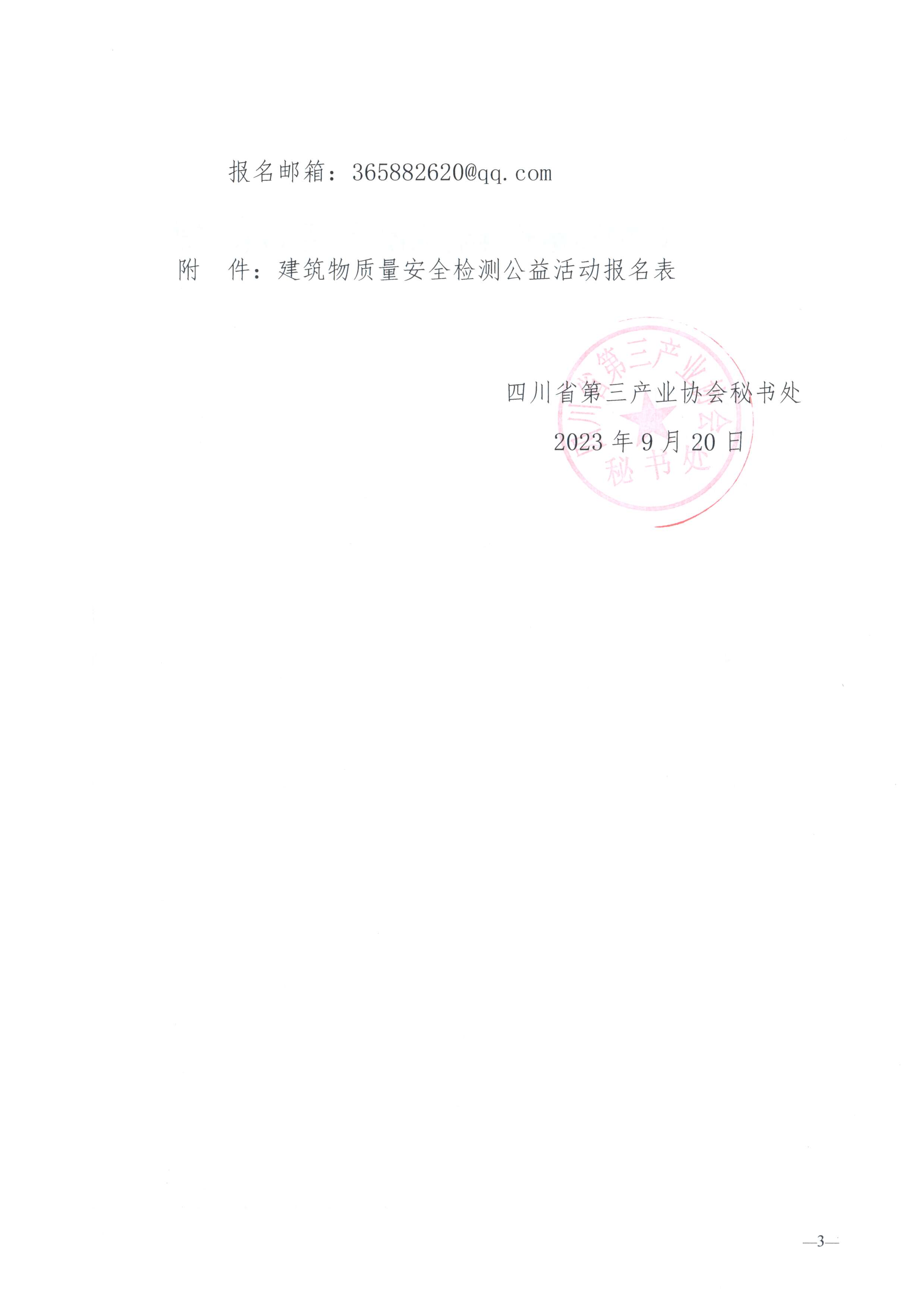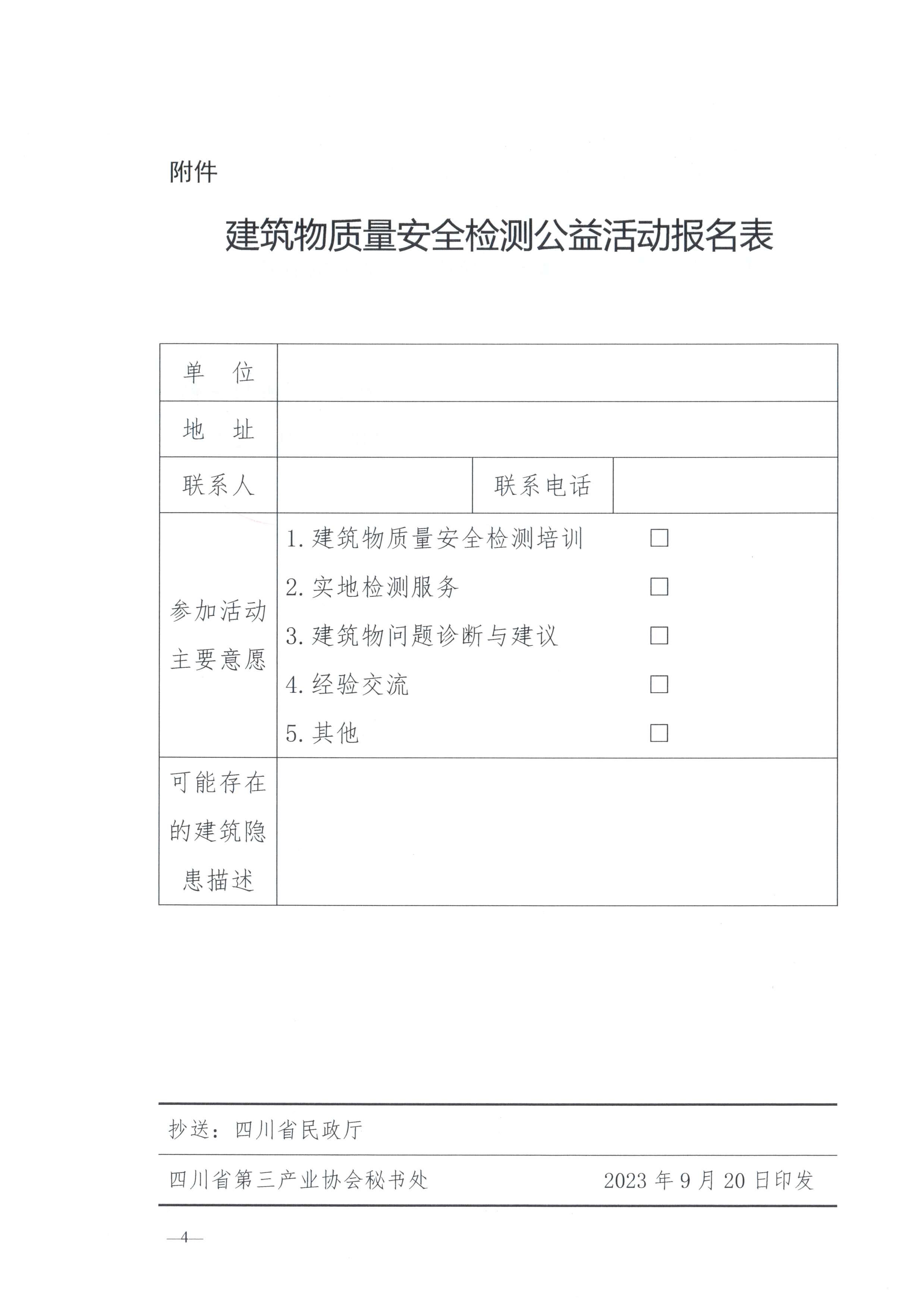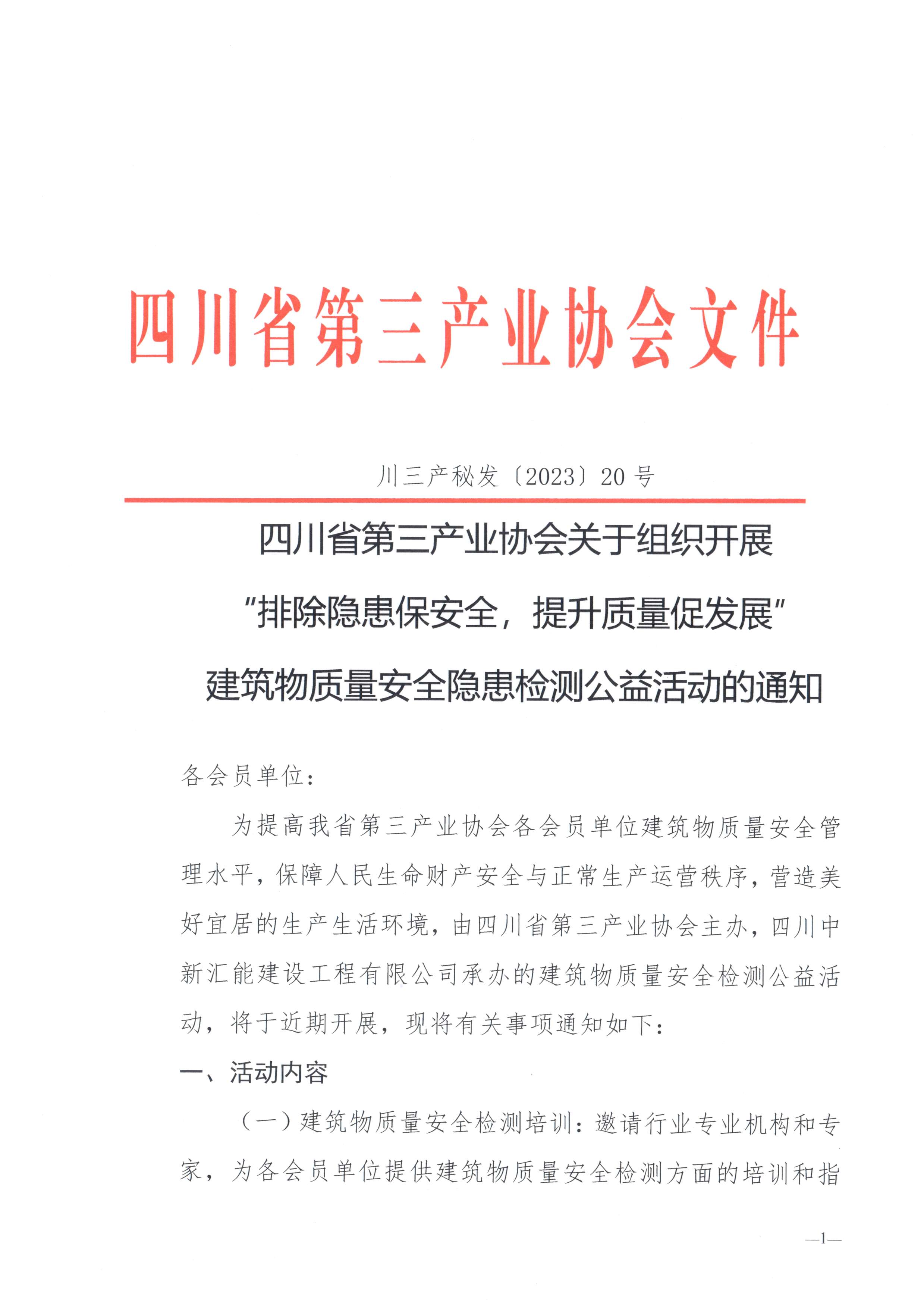 川三产秘发【2023】20号 关于组织开展“排除隐患保安全,提升质量促发展”建筑物质量安全隐患检测公益活动的通知