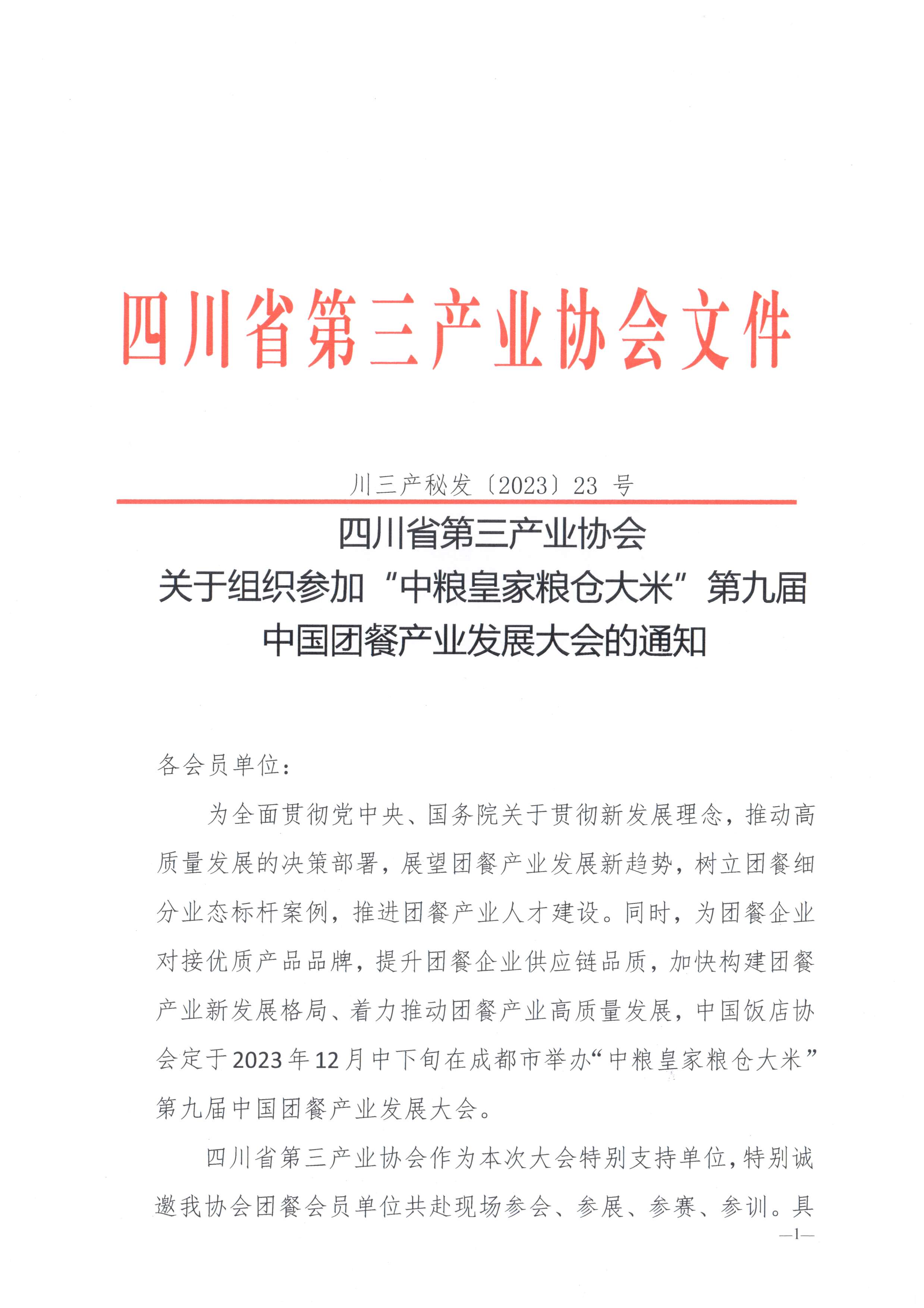 川三产秘发〔2023〕23号四川省第三产业协会关于组织参加“中粮皇家粮仓大米”第九届中国团餐产业发展大会的通知