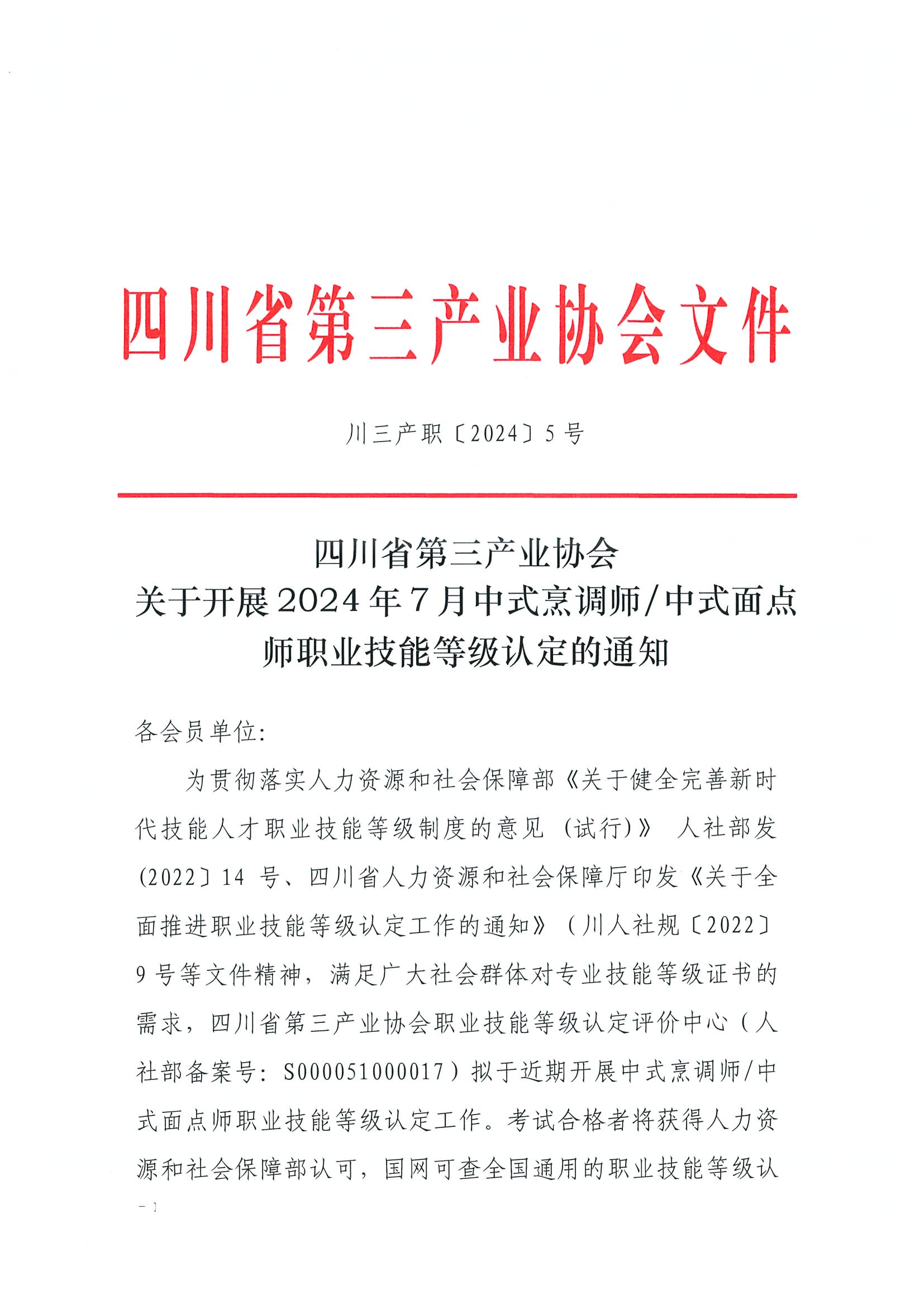 川三产职〔2024〕5号四川省第三产业协会关于202407中式烹调师中式面点师职业技能等级认定的通知
