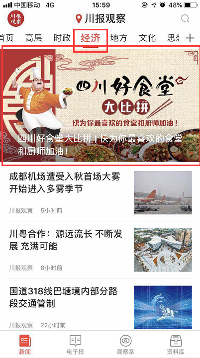 2、如果你已经下载了川报观察客户端,请在经济频道的焦点图位置找到《四川好食堂大比拼 | 快为你最喜欢的食堂和厨师加油!》一文。在本文中点击第一张图,即可跳转至投票界面。